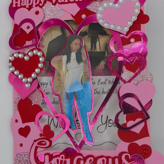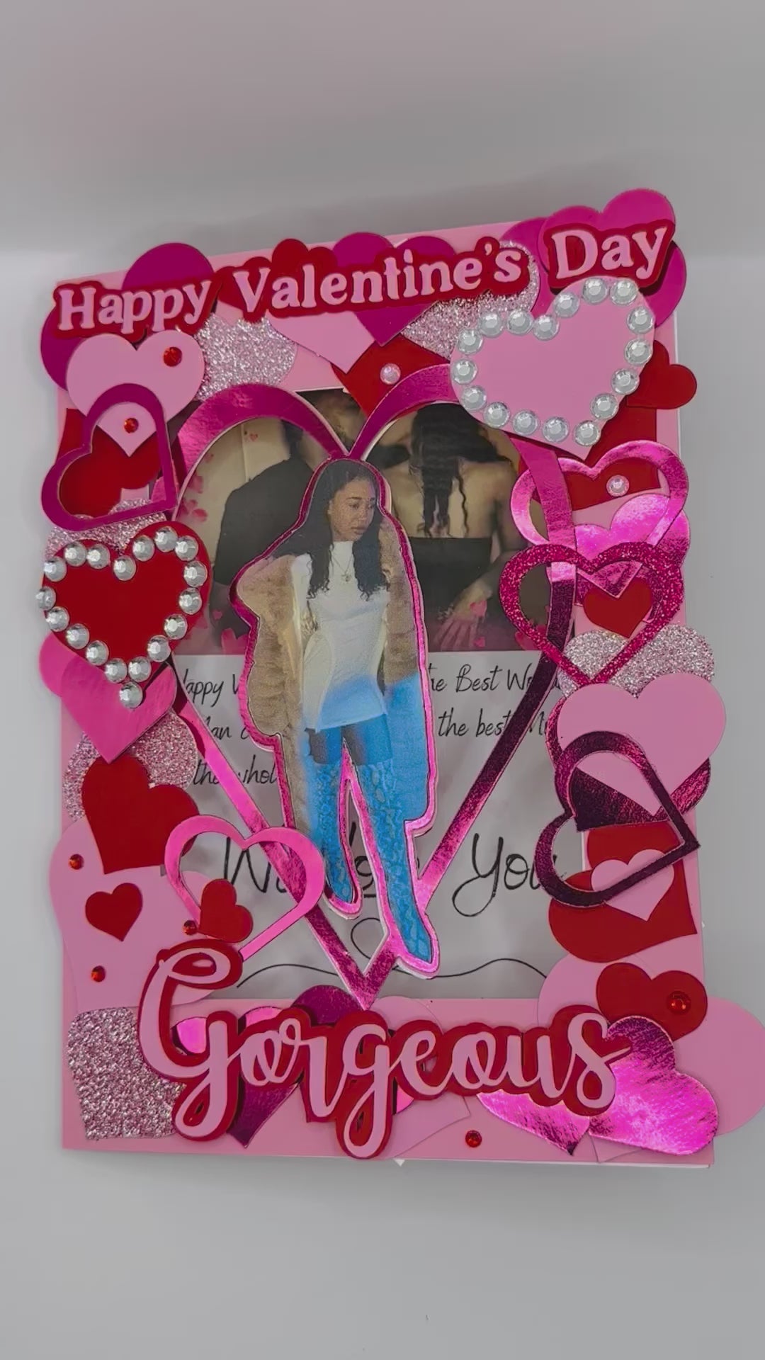 Hearts Galore! This card is carefully handcrafted and designed to focus the attention on your Valentine! With a full body photo in the front center, and surrounded hearts, different sizes and shades and pink, their heart will melt! This is definitely a keepsake!